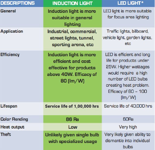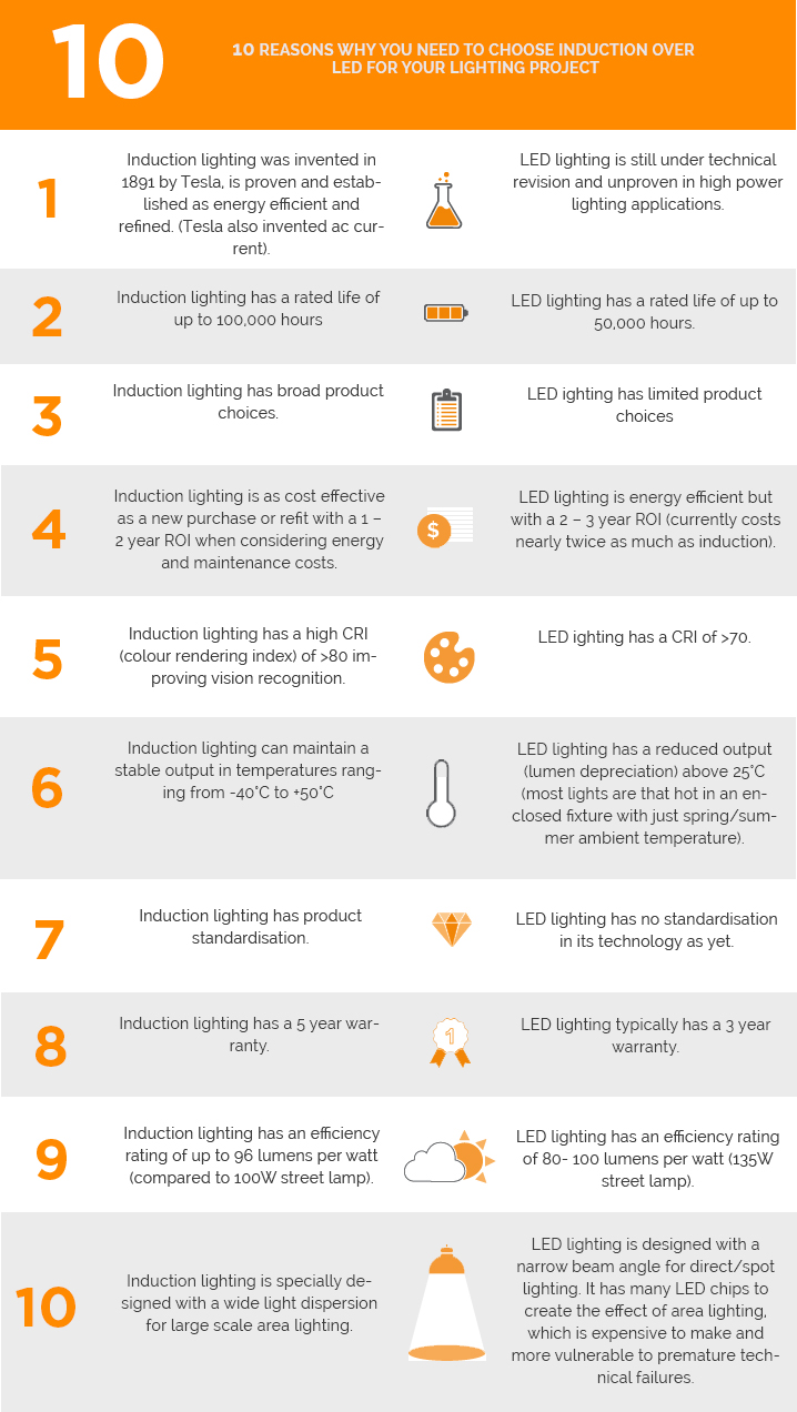 LED technology is at the forefront of energy saving lighting solutions and is promoted as the best alternative to conventional lighting due to its longevity and energy saving benefits. Induction lamps have a life-span of 80,000 to 100,000 hours (depending on type and model). The major difference between the technologies is in conversion efficiency (energy utilisation) and costs. This is particularly significant where a large area of illumination is needed, for example, outdoor, warehouse, or gymnasium settings.