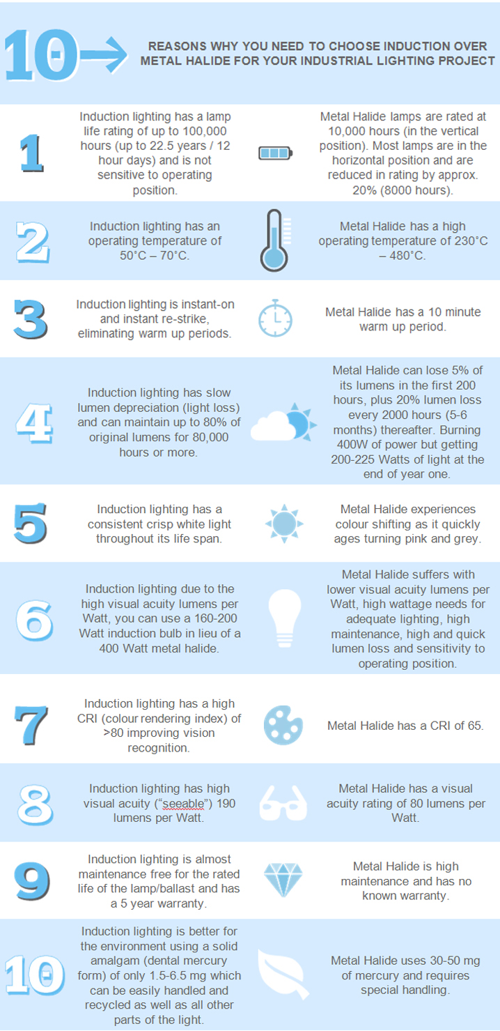 • Induction Lighting has a bulb life rating of up to 100,000 hours. HPS is rated for 20,000 hours.